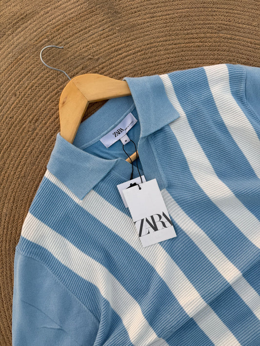 Executive Knitted Polo - Cool Blue with White